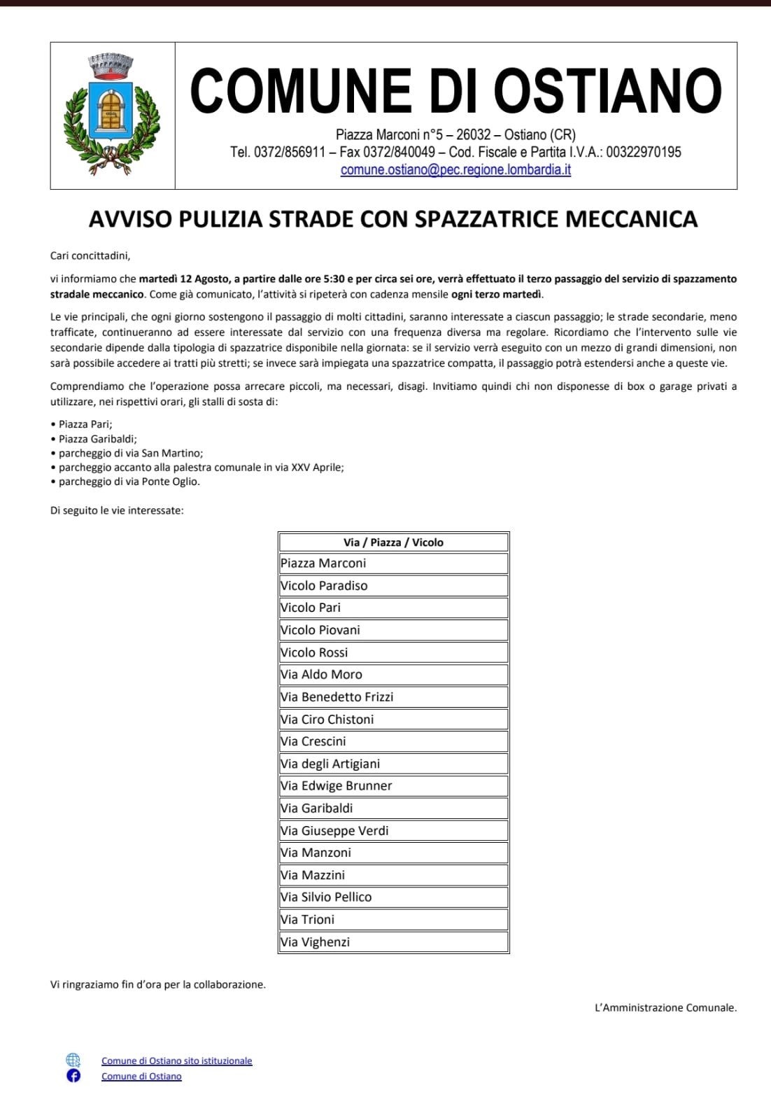 VI INFORMIANO CHE MARTEDì 12 AGOSTO A PARTIRE DALLE ORE 05.30 E PER CIRCA SEI ORE , VERRà EFFETTUATO IL TERZO PASSAGGIO DEL SERVIZIO DI SPAZZAMENTO STRADALE MECCANICO.