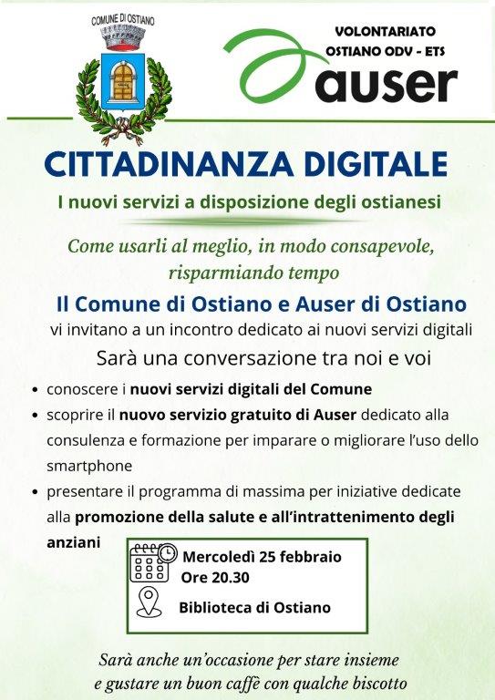 Descrizione IL COMUNE DI OSTIANO E AUSER DI OSTIANO VI INVIATANO A UN INCONTRO DEDICATO AI NUOVI SERVIZI DIGITALI MERCOLEDì 25 FEBBRAIO 20.30 BIBLIOTECA DI OSTIANO .